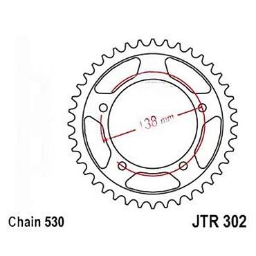 - Dizajn i mere odgovaraju motociklima koji koriste JTR 302 šemu nosača i lanac 530. Pre kupovine uporediti skicu sa postojećim lančanikom (prečnik centra 138 mm, rupa Ø12,5 mm, raspored rupa).