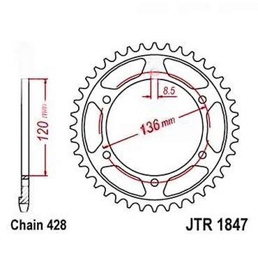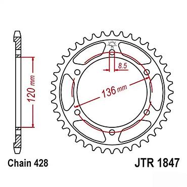 Idealno rešenje za zamenu ili prilagođavanje prenosa na motociklima koji koriste specifikacije JTR 1847 i lanac 428. Obratiti pažnju na mere sa crteža (136 mm PCD, 8,5 mm rupe, 120 mm centar) radi tačnog uklapanja.