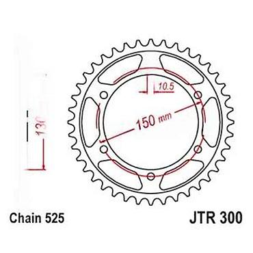 Kompatibilno sa motociklima koji koriste šemu pričvršćivanja JTR 300 i lanac 525. Idealan za pouzdan prenos snage, stabilnu akceleraciju i dug vek trajanja. Pre ugradnje proveriti mere sa postojećim lančanikom (PCD 150 mm, 5 rupa, Ø rupe 10,5 mm).