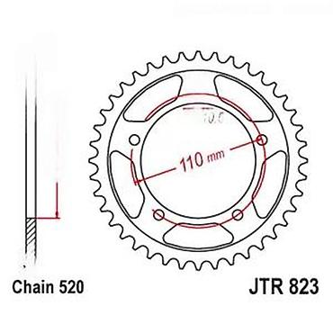Zadnji lančanik za motocikl, model JTR 823, dizajniran za lanac tipa 520. Izrađen je od metala tamno sive boje i poseduje 45 zuba. Unutrašnji prečnik je 110 mm, sa razmakom rupa od 87 mm i prečnikom centralne rupe od 10.5 mm. Pogodan je za zamenu ili nadogradnju pogonskog sistema motocikla.