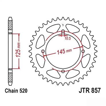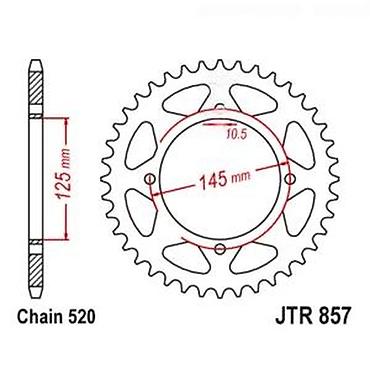 Pogodno za motocikle koji koriste šemu montaže JTR 857 i lanac 520. Proverite dimenzije sa skice (145 mm PCD, 10,5 mm rupe) za tačno uklapanje. Idealno za zamenu zadnjeg pogonskog zupčanika i prilagođavanje prenosnog odnosa.