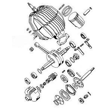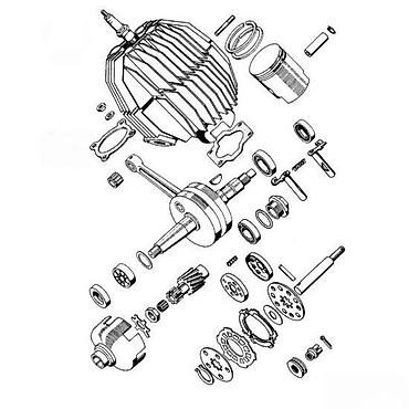 - Tipična primena: sklop motora prikazan na šemama – dvotaktni agregati manjeg zapreminskog obima (npr. mopedi, skuteri, kros i pit bajkovi, radne mašine slične konfiguracije)