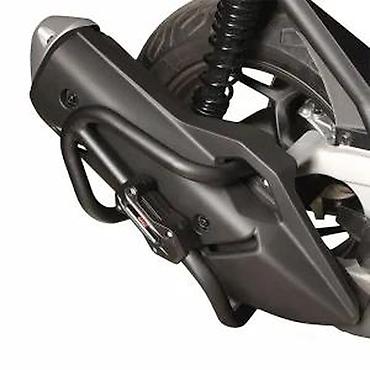 - Robusna zaštitna šipka za zadnji lonac auspuha, dizajnirana da zaštiti auspuh i bočne plastike od ogrebotina i oštećenja pri padu ili naslanjanju skutera.
