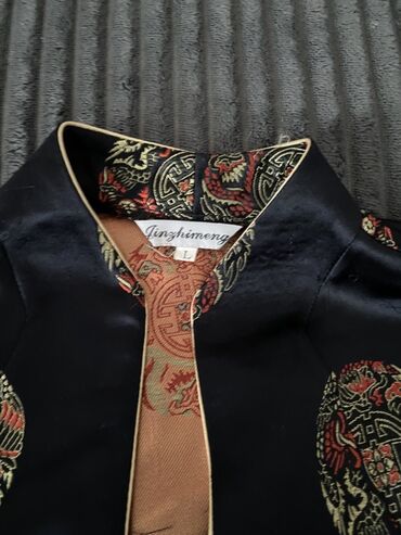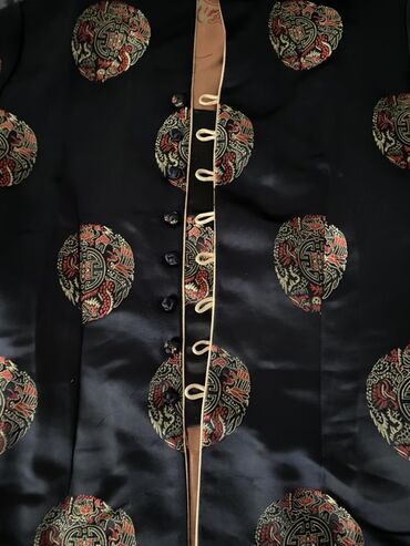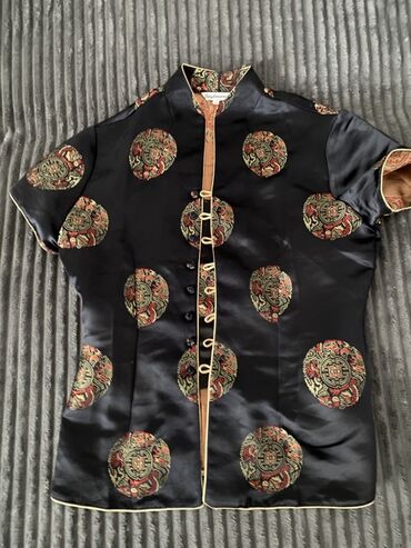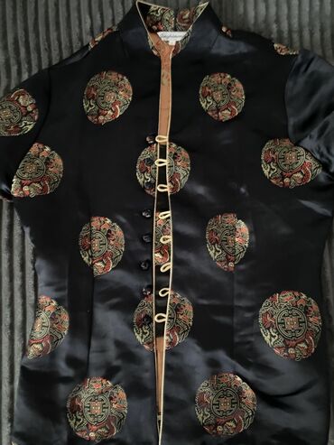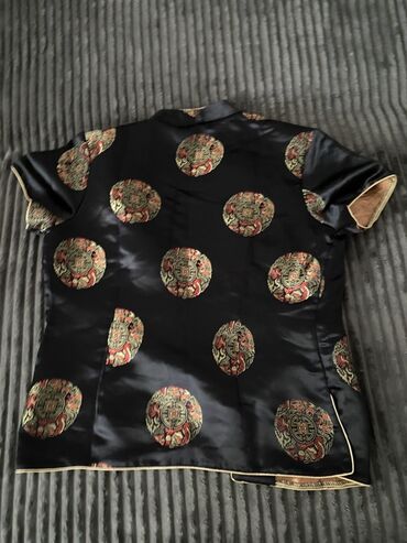 DrugoŽenska kineska bluzica/kratki sako od sjajnog, satenskom tkanja crne boje sa bogatim žakard motivima zlatno-crvene boje (okrugli ornamenti sa zmajevima i kineskim simbolima).