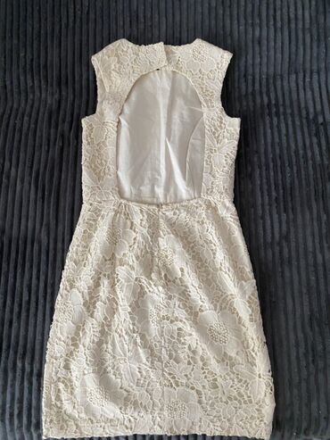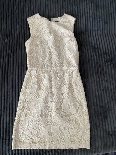 Drugi materijalZara Basic haljina bez rukava, veličina XS (EUR/USA XS). Boja: krem/šampanj. Model: uska silueta do iznad kolena, struk naglašen. Materijal: čipka sa izraženim cvetnim motivom preko podstave u istoj boji. Leđa sa većim otvorom u gornjem delu i skrivenim kopčanjem pri vrhu. Okrugli izrez napred, diskretan šav u struku, fina završna obrada ivica. Elegantan komad pogodan za svečane prilike i letnje događaje. Made in Morocco.
