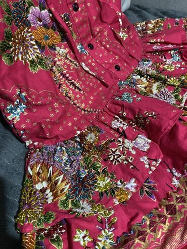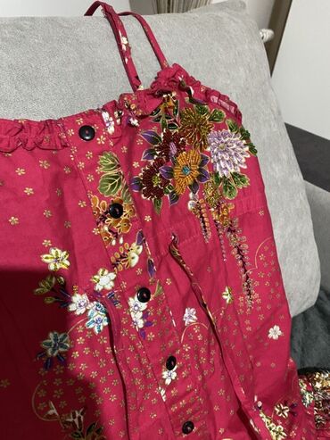 Ženska kratka haljina u fuksija boji, ukrašena bogatim cvetnim dezenom i detaljima. Haljina ima tanke bretele, kopčanje na dugmad duž prednjeg dela i slojevit, naboran donji deo, sa dodatnim slojem tila za volumen. Dizajn sa cvetnim vezom i perlama dodaje eleganciju, čineći je pogodnom za razne prilike.