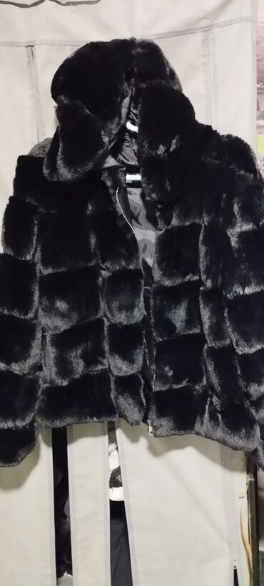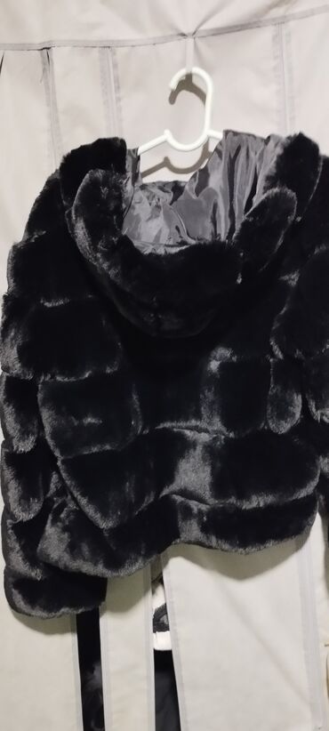 Crna ženska jakna od veštačkog krzna sa kapuljačom.