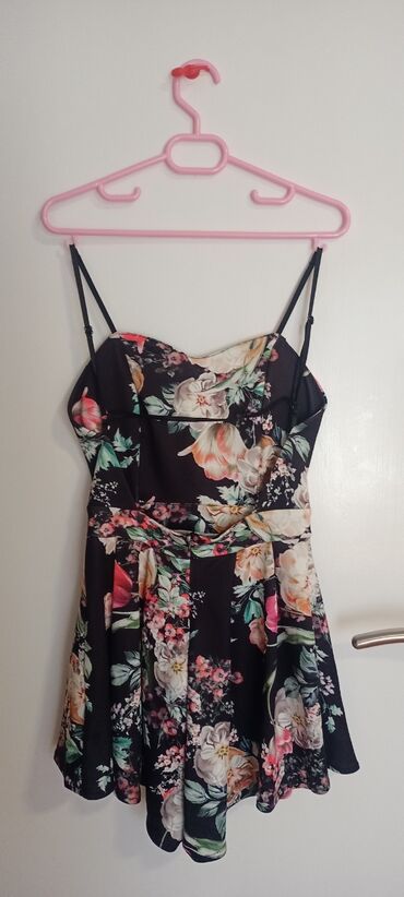 Stradivarius haljina, veličina M. - Dužina: 82 cm - Poluobim grudi/struka: 38–40 cm - Materijal: 85% viskoza, 15% pamuk - Plava podloga sa cvetnim printom u toplim tonovima - Tričetvrt rukavi - Uk...