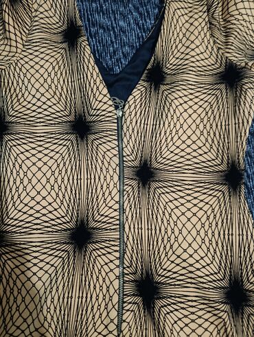 - Dizajn: geometrijski/optical print u oker-žutoj sa crnim mrežastim uzorkom i „zvezdastim” motivima po kvadratima