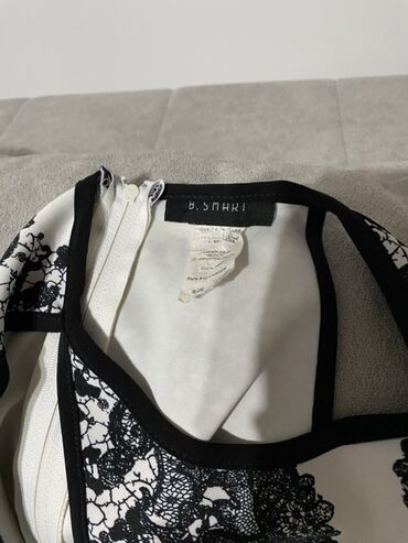 - Dizajn: simetričan crni floralni/čipkasti print preko bele osnove; kontrastne crne ivice oko rukokruga i izreza