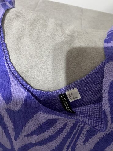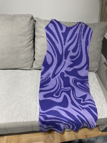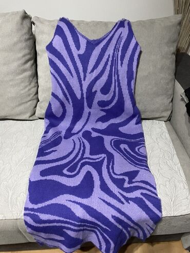 DrugoPletena haljina bez rukava u ljubičasto-lila kombinaciji sa apstraktnim, talasastim šarama. Midi/duža dužina, blagi A-kroj sa lagano talasastim rubom. V-izrez napred i nazad. Rastegljiv, mekan rebrasti pleteni materijal koji lepo prati liniju tela. Brend: Going (etiketa vidljiva na fotografiji), veličina označena kao Free/One Size. Idealna za svakodnevne i večernje kombinacije uz sandale, patike ili čizme. Lako se slojevito nosi preko rolke ili košulje. Boje: tamnoljubičasta i svetloljubičasta.