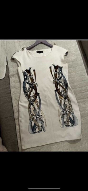 DugmadElegantna ženska haljina – krem/bela, kroj olovka (bodycon), dužina do kolena. Kratki rukavi sa metalnim dugmadima na ramenima, okrugli izrez. Sa prednje strane dva vertikalna štampana motiva inspirisana lancima/kaisovima u nijansama plave, smeđe i sive, koji vizuelno izdužuju figuru. Zadnja strana jednobojna. Materijal glatke teksture sa blagim sjajem, postavljena, lagano elastična za lepše prijanjanje. Zatvaranje pozadi skrivenim rajsferšlusom. Idealna za svečane prilike, večernje izlaske ili poslovni elegantni stil.
