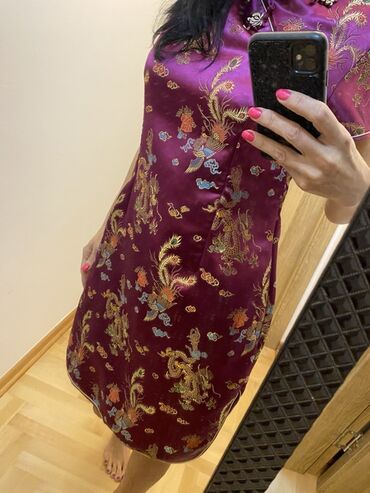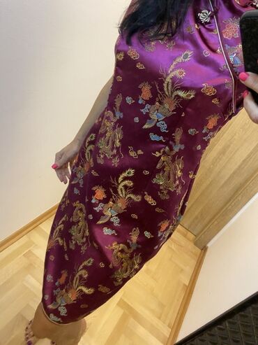 Svilena qipao/cheongsam haljina u bogatoj boji šljive sa tradicionalnim istočnjačkim motivima zmajeva, feniksa i cvetnih ornamenata u zlatnoj, plavoj i narandžastoj niti.