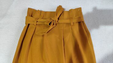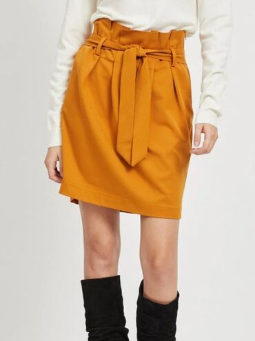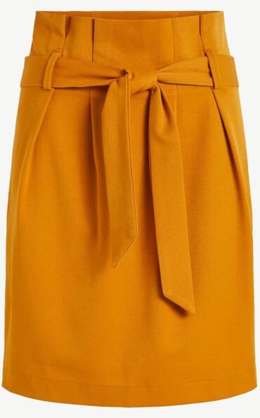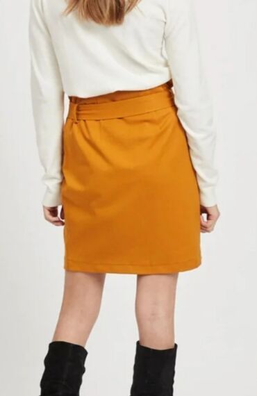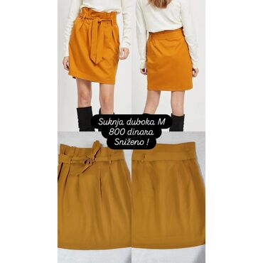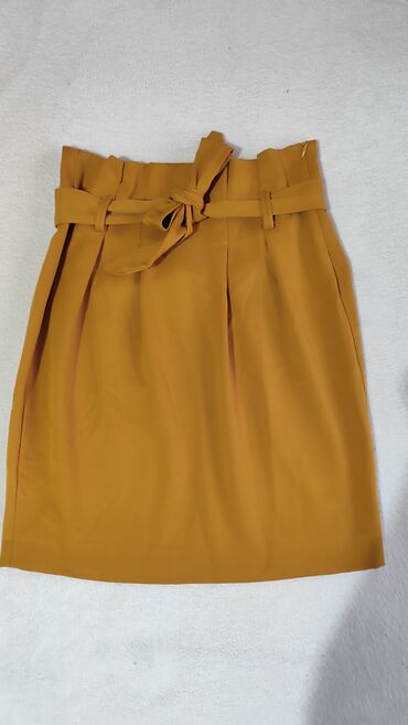 PoliesterSuknja visokog struka, veličina M, senf/okergalna boja. Model ravnog kroja do iznad kolena, sa nabranim pojasom i dekorativnim kaišem/vezicom koja se zateže napred. Ima diskretne faltice ispod pojasa koje naglašavaju struk. Materijal je gladak, prijatan i lepo pada. Pogodna za kombinovanje uz košulje, rolke i čizme.