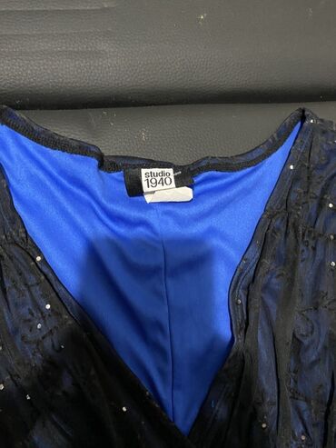 Drugi dekorHaljina “Studio 1940” – elegantna, tamnoplava/safirno plava podstava sa crnom providnom mrežom preko.
