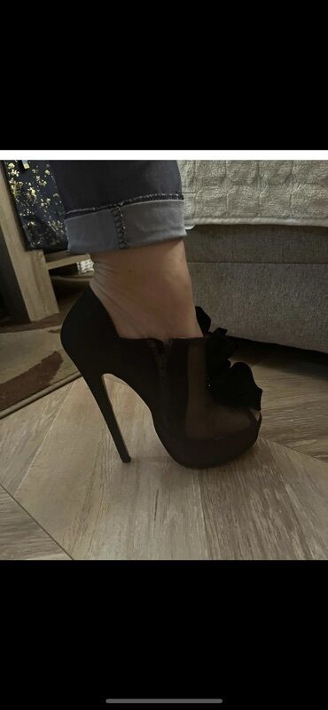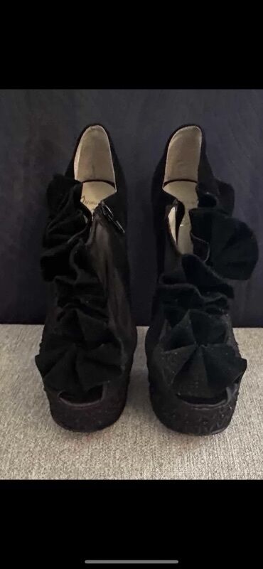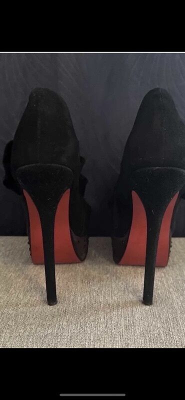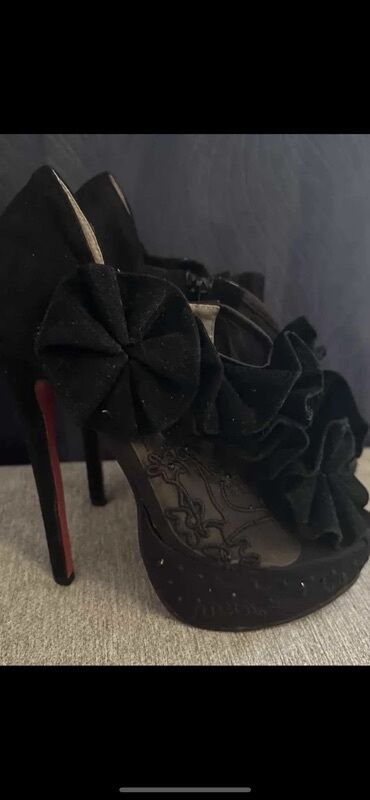 O trošku kupcaLouobutin kopija 1/1Crne ženske salonke na visoku štiklu sa platformom i otvorenim prstima (peep-toe). Gornjište od crnog somota/baršuna, dekorisano velikim naboranim cvetnim mašnama duž risa. Bočne strane imaju providne mrežaste umetke sa dekorativnim vezom. Unutrašnjost svetle boje. Veoma visoka tanka štikla, potplat sa prepoznatljivim crvenim đonom. Bočno kopčanje rajsferšlusom za lako obuvanje. Dramatičan, večernji model – upečatljiv dizajn za posebne prilike.