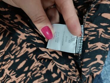 - Boja i dezen: crna baza sa apstraktnim narandžasto‑bež printom