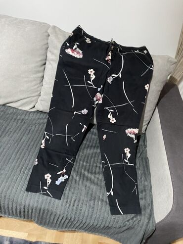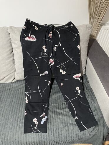 - Model 1: crne pantalone sa cvetnim printom i apstraktnim linijama. Ravne nogavice, elastičan struk sa učkurom za podešavanje. Lagani, prijatni materijal, pogodne za svakodnevno nošenje ili ležerne kombinacije.