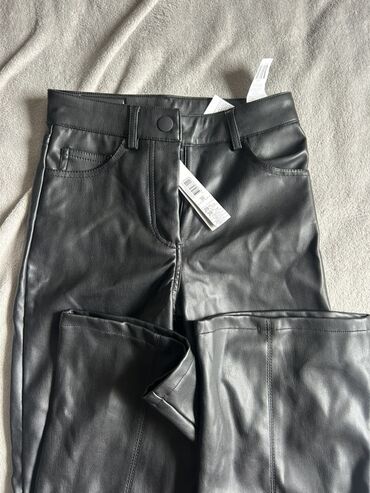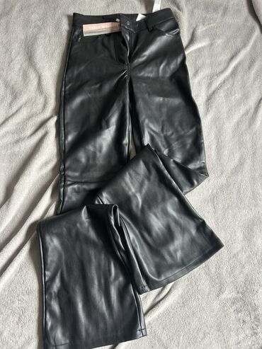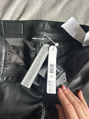 Univerzalne crne kožne pantalone koje se lako kombinuju uz majice, košulje i čizme/patike za dnevne i večernje kombinacije. Cena na etiketi: 29.99 EUR (prikazano na tagu).