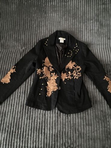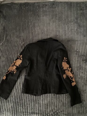 - Boja: crna sa bogatim zlatno‑braon floralnim vezom na prednjem delu i rukavima