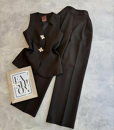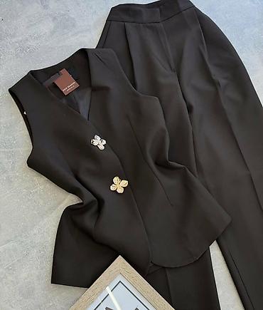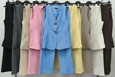 Ženski komplet bez rukava – prsluk i široke pantalone - Kroj: elegantan, ravne široke nogavice; struk naglašen širokim pojasom/mašnom - Gornji deo: prsluk bez rukava sa reverima, duplo kopčanje iz...