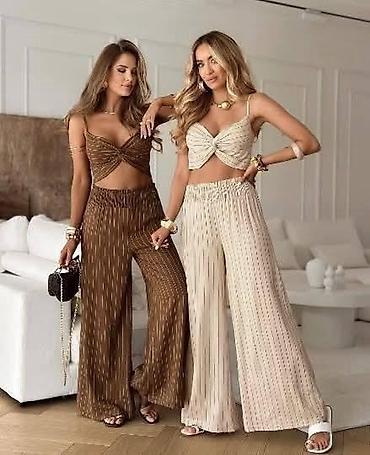 - Moderan komplet sastavljen od crop topa sa bretelama i efektnim čvorom napred, uz visok struk i široke, lepršave pantalone.