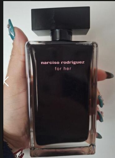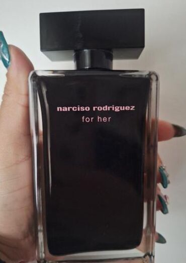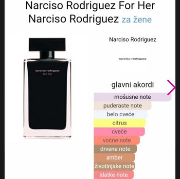 - Crna staklena bočica sa kvadratnim crnim poklopcem; ružičasti natpis “narciso rodriguez for her”