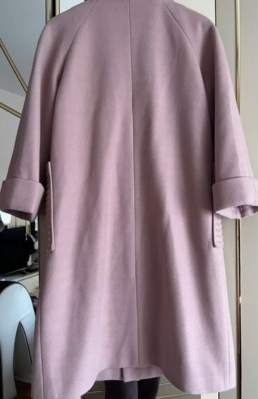 Drugi materijalŽenski kaput u svetlo‑ružičastoj boji, elegantnog A kroja do kolena. Model sa rever kragnom i dvorednim kopčanjem sa dva tamna dugmeta. Rukavi su 3/4 dužine sa podvrnutim manžetnama. Poseban detalj čine dve velike prednje torbice sa reljefnom teksturom kvadratića. Ravna leđa sa centralnim šavom, glatka postava iznutra. Materijal je kompaktan i mek na dodir, pogodan za prelazne i hladnije dane. Moderne linije i minimalistički dizajn koji se lako kombinuje uz poslovne i casual kombinacije. Brend: Morey (etiketa na unutrašnjem delu). Color: pastel pink.
