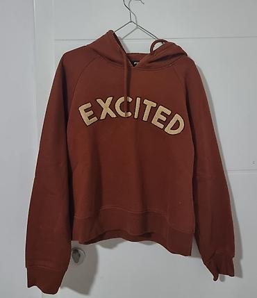 - Dukserica sa kapuljačom, boja zagasito crvena/terakota. Velike aplikacije na prednjoj strani sa natpisom “EXCITED”. Kengur džep nije prisutan; ravni donji porub, ranfle na rukavima, učkur na kapuljači. Velicina M/L. Cena:600 dinara