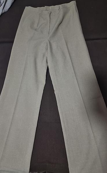 - Pantalone 1: svetlosive, klasičan kroj ravne nogavice. Skriveni rajsferšlus napred sa kukicom/dugmetom, plisirani detalji ispod pojasa. Veličina:S. Cena 700 dinara