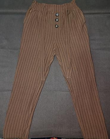 - Pantalone 3: crno-bele vertikalne pruge. Papir-bag struk sa naborima i trakama/pojasom, bočni džepovi, ravna/šira nogavica. Velicina: S. Cena: 500 dinara