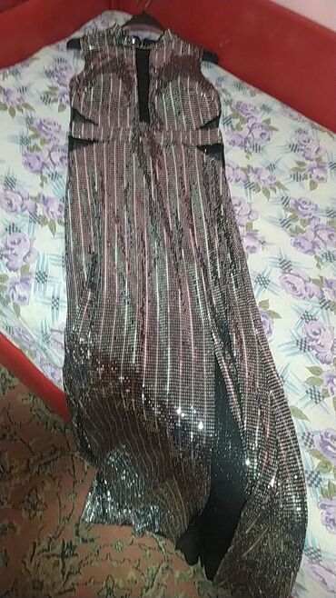 • Duga svečana haljina sa šljokicama: uska silueta, visoki prorez, prozirni crni paneli na bokovima i dekolteu, vertikalni sjajni detalji po celoj dužini.