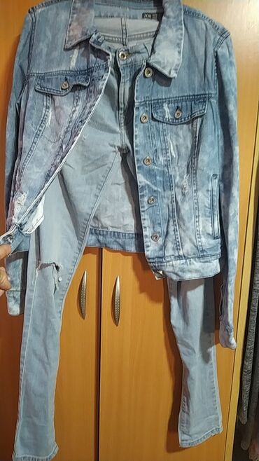 • Ženski set od teksasa: svetloplava teksas jakna sa dugmadima i džepovima na grudima + uske farmerke u istom pranju. Blago izbledeli/„acid wash“ efekat, metalni dugmići, bočni džepovi na jakni.