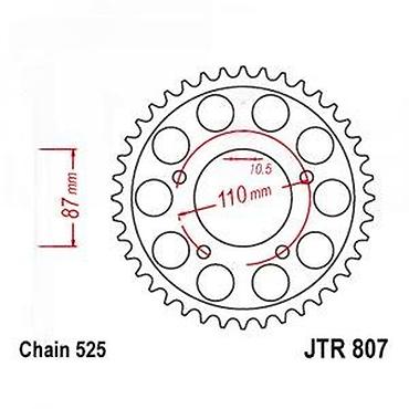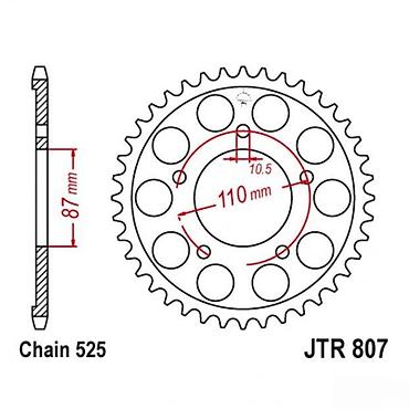 Zupčanik (lančanik) modela JTR 807, dizajniran za lanac tipa 525. Ovaj zupčanik ima prečnik rupe od 110 mm i razmak između rupa za montažu od 87 mm, sa prečnikom svake rupe od 10.5 mm. Pogodan je za upotrebu na motociklima i drugim vozilima koja koriste odgovarajući tip lanca i dimenzije montaže.