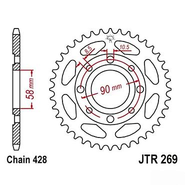 Zupčanik modela JTR 269, dizajniran za lanac tipa 428. Karakteriše ga centralni prečnik od 90 mm i unutrašnji prečnik od 58 mm. Poseduje rupe za montažu sa dimenzijama 8.5 mm i 10.5 mm, što omogućava sigurnu i preciznu instalaciju. Idealan je za različite primene gde je potrebna pouzdana komponenta za prenos snage.
