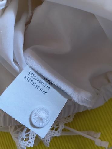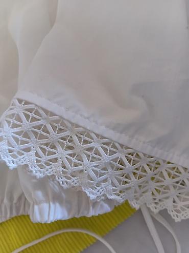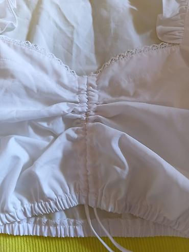 - Bluza: bela, kratka (crop) dužina sa vezicom za podešavanje u struku. Dubok V-izrez sa volančićem, diskretan čipkani porub oko izreza i na rubovima rukava. Rukavi 3/4 do puni, lagana tkanina prijatna za kožu. Romantičan, boho izgled koji se lako uklapa sa visoko strukiranim donjim delovima.