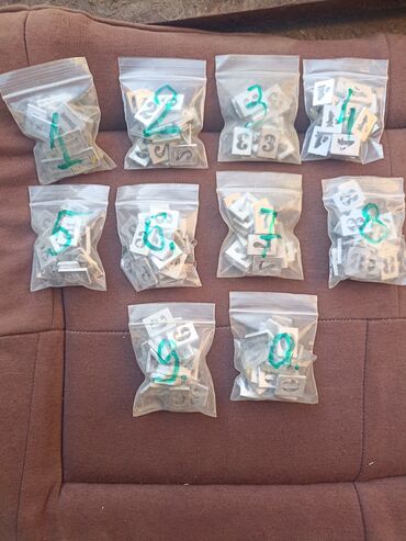 Brojevi od 1 do 0 ,isečeni u aluminijumske pločice debljine 3 mm širina 14 mm visina 20 mm,svaki broj u kesici sadrži 20 komada , cena je za svih 200 kom, upotreba za razna numerisanjai obeležavanja.