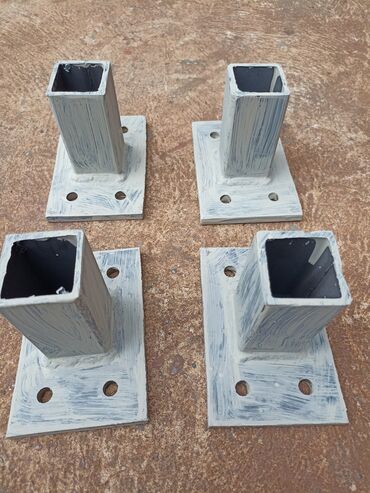 Četri metalne stopice za razne stubove, ploča debljine 10 mm x 100 mm x 150 mm sa rupama fi 10 mm ,na nju završena kutija (četvrtasta kutija- cev 50 mm x 50 mm visine 100 mm ) unutrašnja šupljina 40 mm x 40 mm, četri komada na stanju cena je za sve četiri .