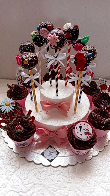 Predivan set za proslavu prvog rođendana, sa tortom na tri nivoa, ukrašenom roze mašnama i jestivim detaljima. Na vrhu torte nalaze se čokoladni "cake pops" štapići, svaki sa jedinstvenim šarenim ukrasima i mašnama u raznim bojama, dodajući igru i živost. Oko torte su raspoređeni čokoladni mafini sa bogatim filom i raznovrsnim ukrasima, uključujući likove iz crtanih filmova, pečurkice i cvetiće, savršeni za dečje rođendane ili druge proslave. Svaki mafin je smešten u roze papirnu korpicu, što doprinosi slatkom i dopadljivom izgledu celokupnog seta.