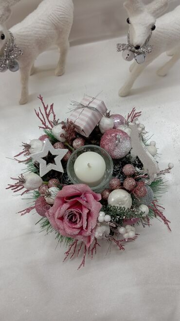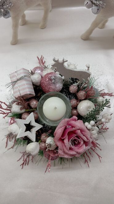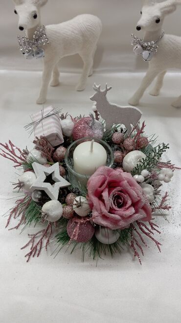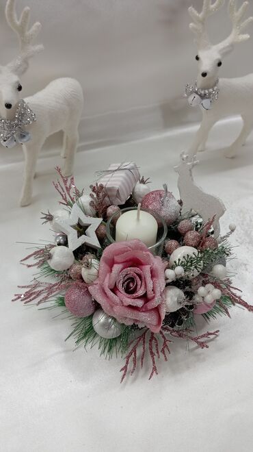 - Materijali: kombinacija veštačkog cveća i zelenila, ukrasnih kuglica i figurica; sveća u staklenom držaču.