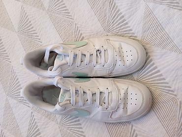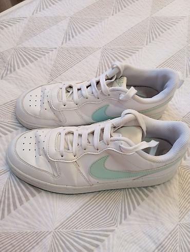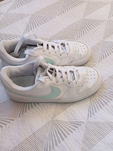 Nike ženske patike – niske, bele sa mint zelenim Swoosh logom.Duzina gazista 24,5 cm.
