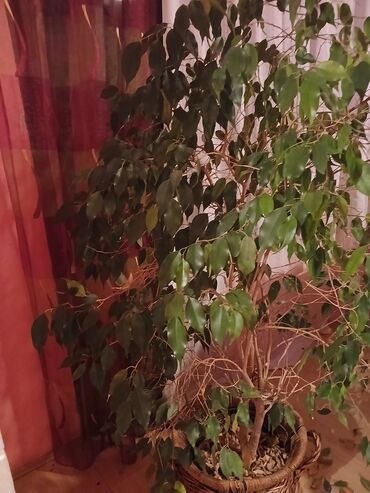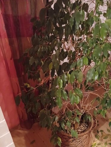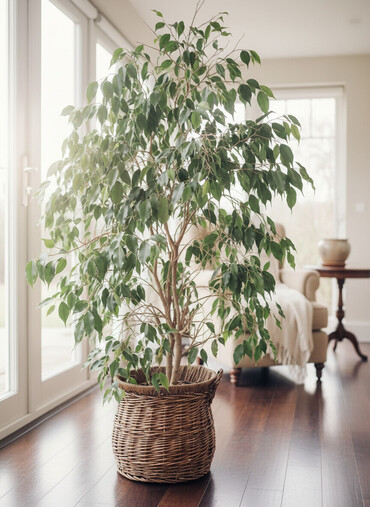 Veliki sobni fikus benjamin (Ficus benjamina) u dekorativnoj pletenoj saksiji.