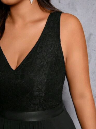 - Gornji deo: čipka sa diskretnim cvetnim dezenom, V-izrez napred i blago zaobljen izrez pozadi