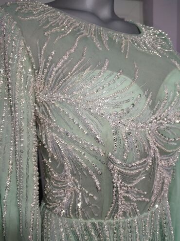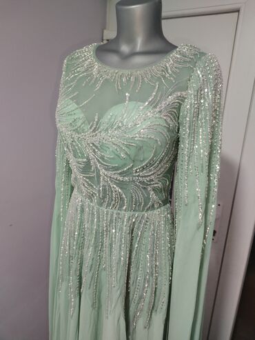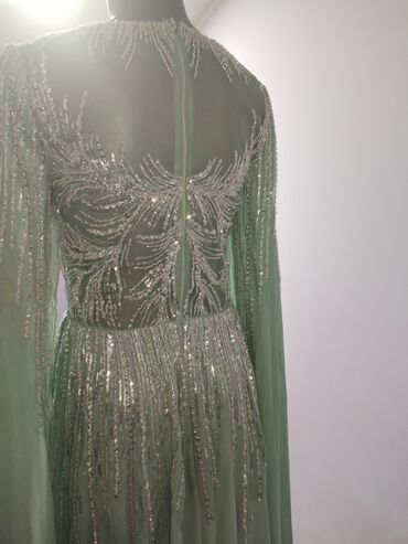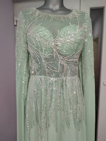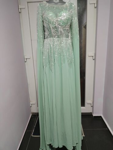 Elegantna večernja haljina – crna, duga, sa dramatičnim šlepom i visokim šlicem. - Kroj: sirena/suknja sa naborima napred, visoki otvor na butini, produženi asimetrični šlep sa strane. - Gornji de...