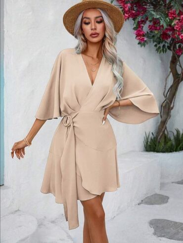 Elegantna ženska haljina u bež boji. XL veličina. - Kroj: preklopni