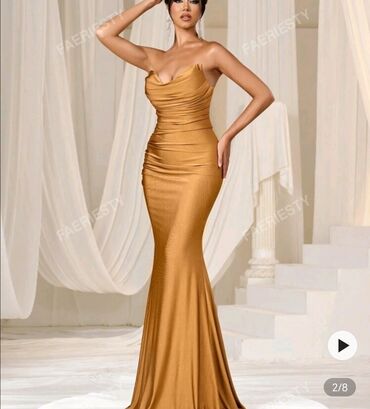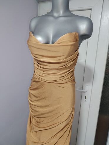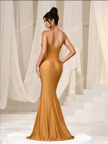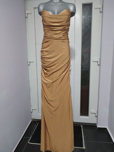 Elegantna duga večernja haljina u toploj zlatno–karamel nijansi.