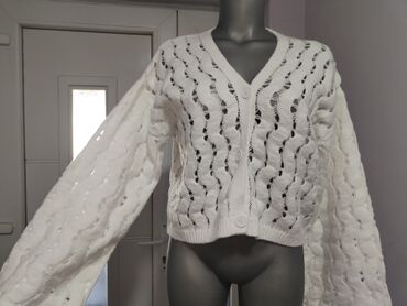 - Pletivo: ajour/čipkasti talasasti uzorak sa prorezima duž celog kardigana