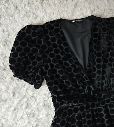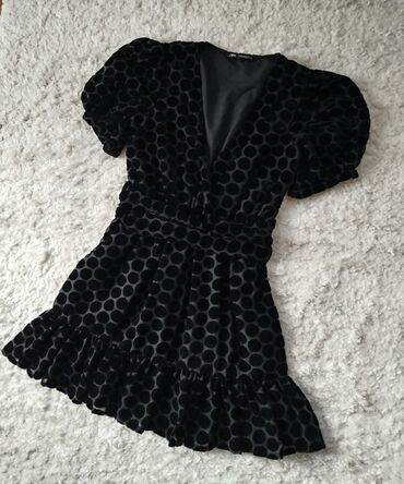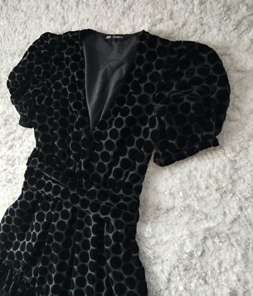 O trošku kupcaZara plišana haljina u crnoj boji plisanog materijala, leprsavog kroja. Veličina piše xs, može i za s. U struku ima pojas od istog materijala i dezena. Ispod pazuha skriveni rajfeslus. Gornji deo sa dekolteom i puff ramenima.