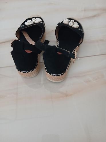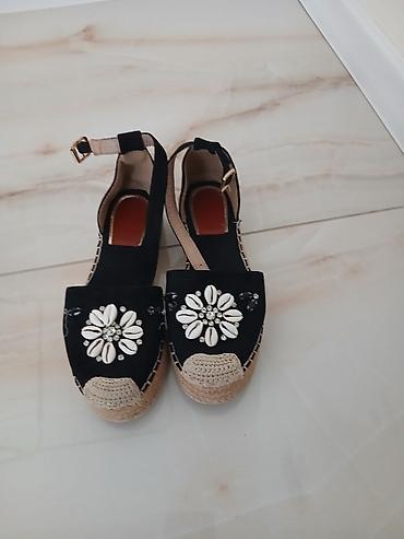 - Sandale/espadrile: crne, sa platformom od jute (espadrile stil), zatvoren prednji deo ukrašen školjkicama i sitnim ukrasnim kamenčićima u obliku cveta. Kaiš oko zgloba sa kopčom u zlatnom tonu, prošiv detaljima oko đona.