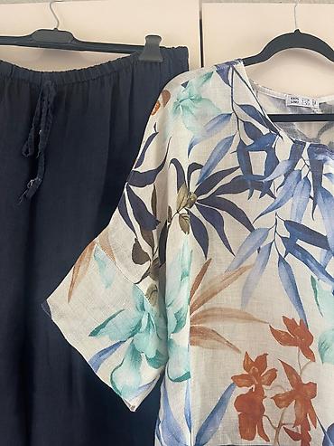 - Materijal: prirodni lan (etiketa “100% LINO” vidljiva na bluzici)